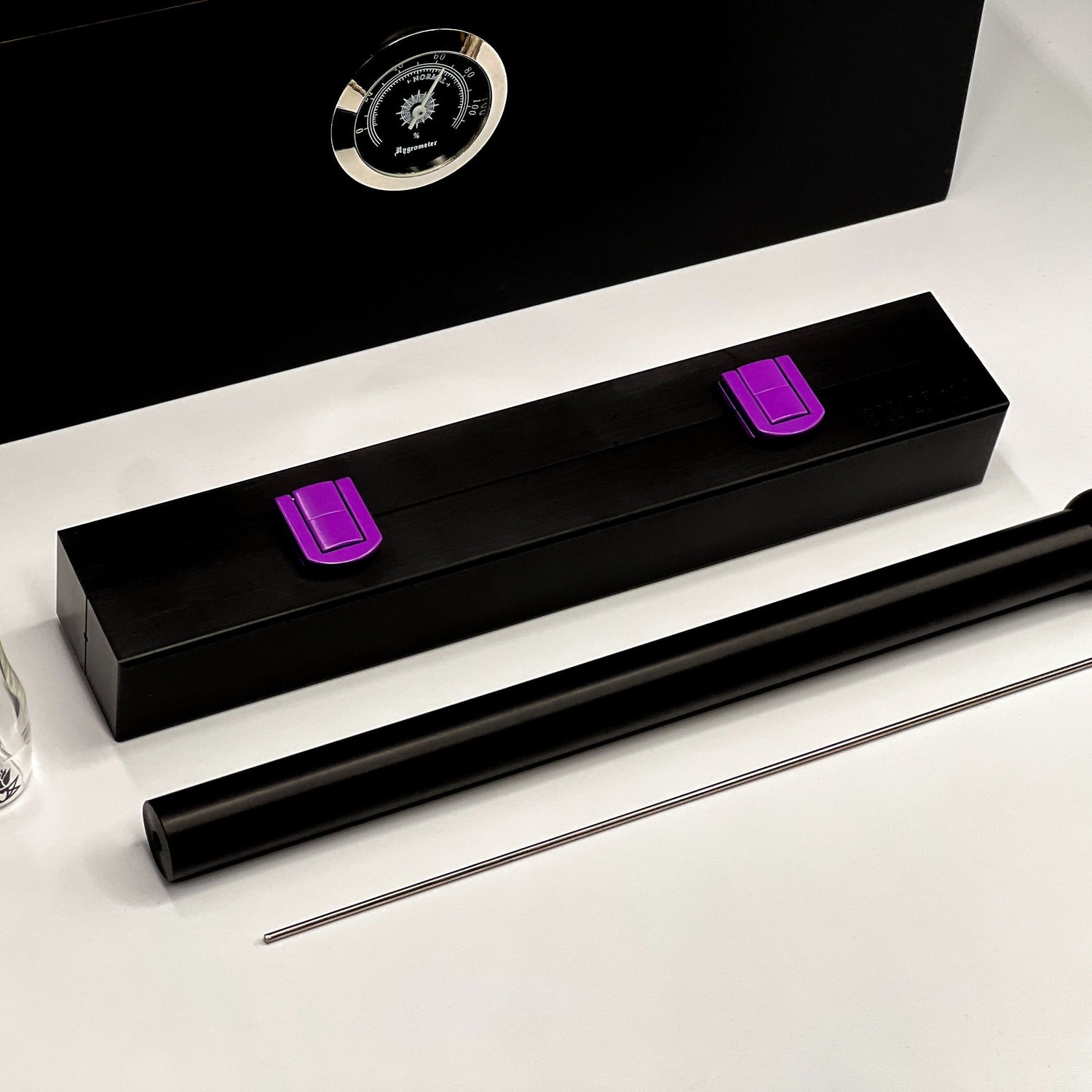 Your custom humidor was made specially with Mahogany wood to ensure the taste and the terpenes of your bud are never affected like it would in a traditional cedar humidor. Pack your Cannagar using the reusable metal skewer to create the perfect airflow. Once packed, let your Cannagar cure for a minimum 4 days for the slowest and smoothest burn. Wrap your 1oz cannagar in your favorite wraps and top with the reusable Glass Tip for a classy feel.