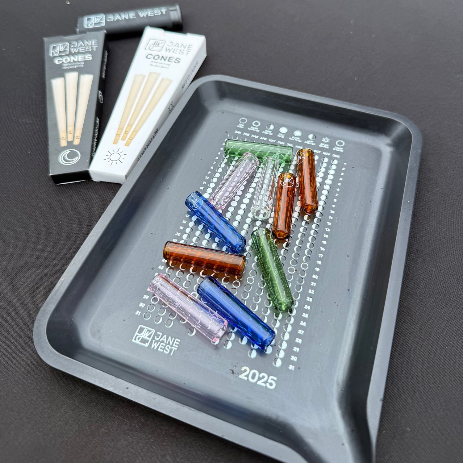 These 3-pack cones come pre-rolled and ready to fill. Each cone is 109mm, made from slow-burning European hemp paper, and comes with a little paper tool so you don't need any rolling skills. Just pack it, pass it, and you're good. The filter tips have the Jane West logo and a moon icon on them. They're tested to be free from dyes, additives, and chlorine, which matters if you care about what you're actually smoking.