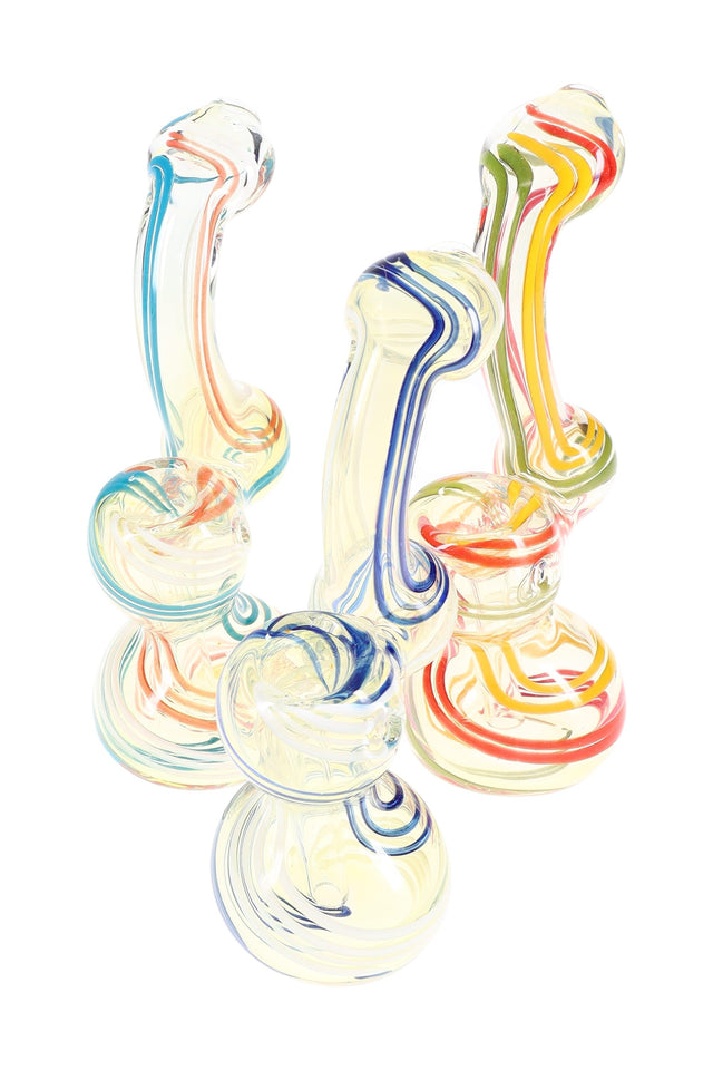 Pocket-size power with a kaleidoscope twist. This 4-inch sherlock bubbler is hand-blown from clear borosilicate and silver-fumed, so every session unlocks deeper blues and greens as heat and resin meet the glass. Bright red, yellow, and teal swirls wrap the bowl and stem, while the built-in water chamber smooths each pull without bulking up your travel kit.