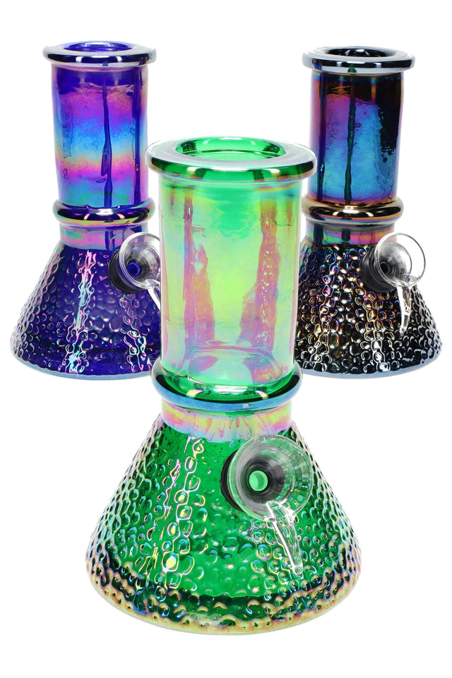 Tiny footprint, huge sparkle. This pocket-friendly 5.5-inch mini beaker turns every sesh into a light show thanks to its iridescent, chrome-rainbow shine and dimple-textured base that catches and scatters the glow.
