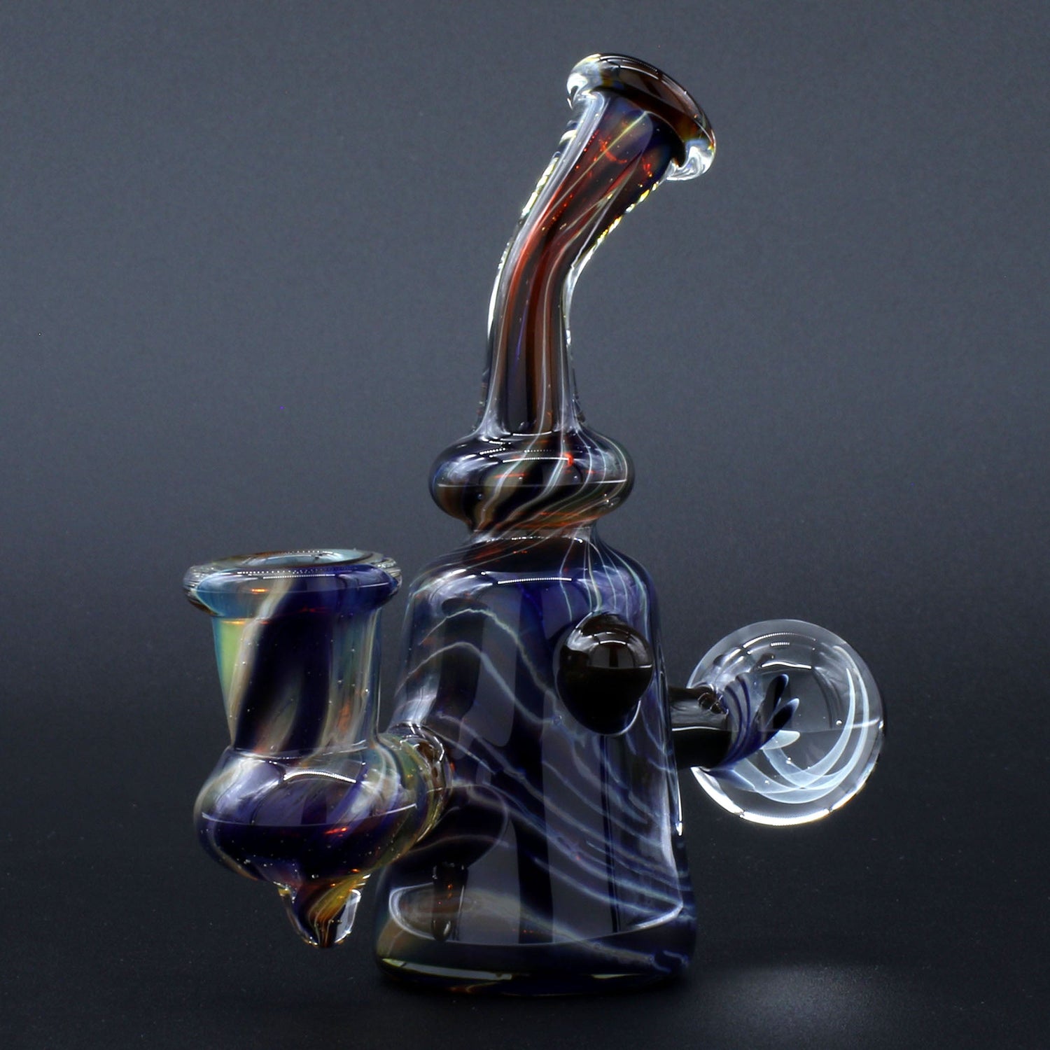 The "Black Moon" is an amazing heady dab rig that can be found in the best online heady glass gallery, LA Pipes. It is made with custom-colored boro glass and features fumed line work in a clear marble. It has a curved fixed down-stem with a custom 2-hole defuser, and a 14mm handmade polished female joint (fits 14mm male) which fits bowls or dab accessories. Compatible with oils or flower, but better with concentrates/oils, this dab-rig offers perfect function and is the perfect size for any enthusiast, being approximately 5 inches.