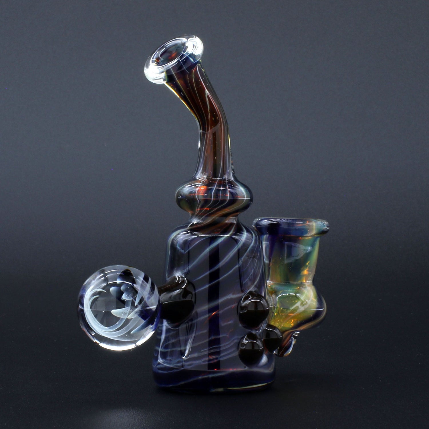 Handblown works of art, ClayBall bubblers and oil rigs are as functional as they are beautiful. Each piece is etched by the artist. All have either gold or silver fuming to bring dynamic colors to the user's experience.