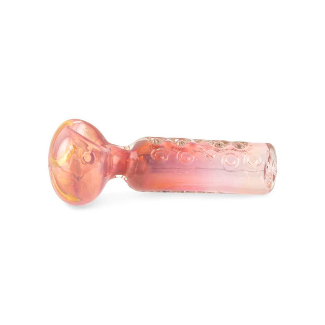 The Custom Glass 5 inch Gold Fumed Pink and Orange Spoon Hand Pipe keeps the classic spoon feel but adds some warmth through color and finish. The gold fumed glass gives it natural depth, while the pink and orange tones bring in just enough contrast to make it interesting without being loud. It feels comfortable in the hand and familiar right away.