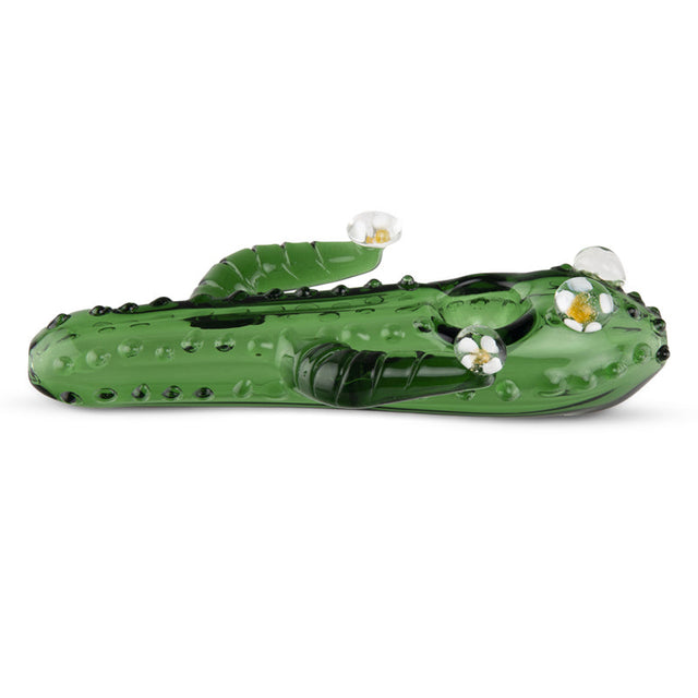 The Custom Glass 5 inch Green Cactus Hand Pipe is one of those pieces that feels fun but still well made. The cactus shape is instantly recognizable, with two front arms and small glass flowers that add detail without feeling fragile. It has a solid feel in the hand and looks more like a display piece than something mass produced.