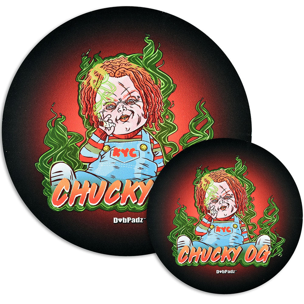 Plus, it's adorned with a Chucky OG screen-printed fabric top for a fun and stylish touch. Not to mention, it will keep your tabletop free from sticky dabs and other messes. This mat is available in two sizes: Small (5-inches) and Large (8-inches).