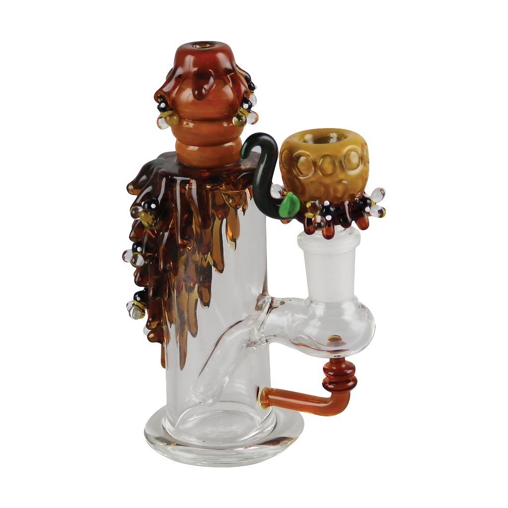 Welcome to the Empire Glassworks Beehive Nano Rig! This mini rig is an ode to the hardworking bees of the world, and a perfect representation of Empire Glassworks' commitment to quality and innovation. It's made in the USA with American glass and features a detailed image of a beehive packed with honey and surrounded by working bees.