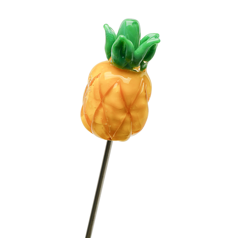 Empire Glassworks' pokers are a testament to their lampwork mastery. A fully worked figurine sealed on a metal poker to get to hard to reach places or cleaning out tough dirty bowls. This Pineapple Poker features a sweet tropical pineapple with green flora on top. The perfect addition to a fruitful workstation.