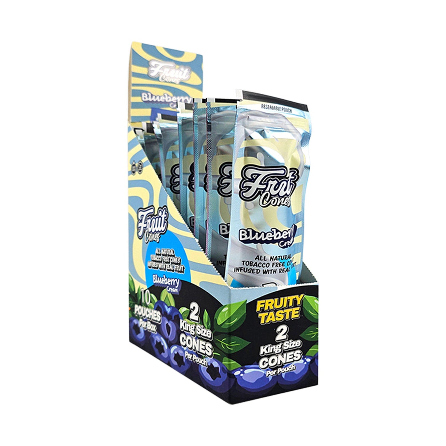 Each cone is pre-rolled and ready to fill, holding up to 2g for longer sessions or sharing. This display includes 10 resealable pouches, each packed with two king size cones. Fruit Cuts are crafted from real mangoes and blueberries, giving each cone its flavor-forward character without relying on artificial additives.