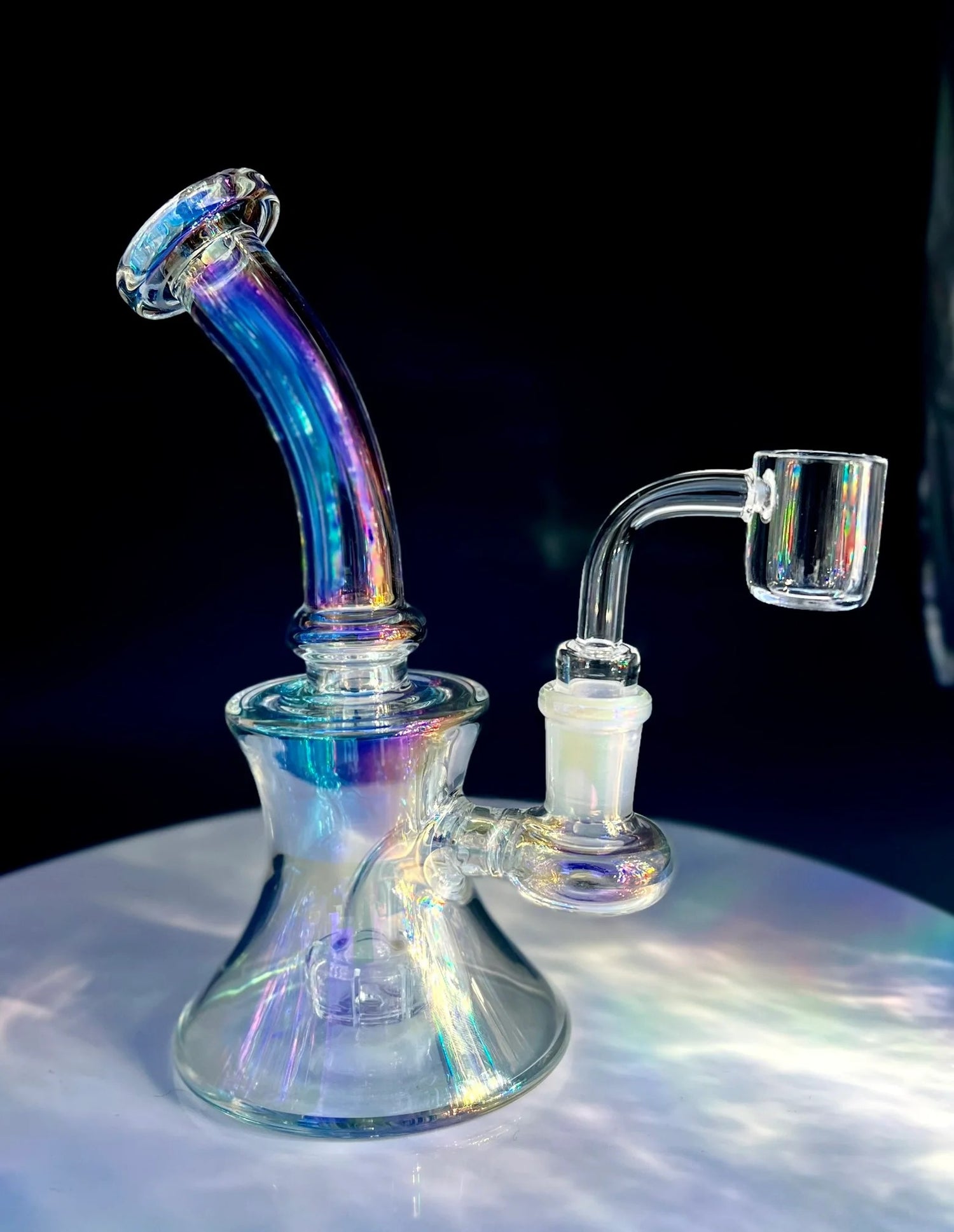 Meet the Glass Bath 6" Holographic Dab Rig — where glossy holographic vibes meet efficient design. This compact dab rig is a visual showstopper and functionally slick, dressed in a rainbow sheen that’s made to pop under every light. Ready to roll with a quartz banger included—just dab and dominate.
