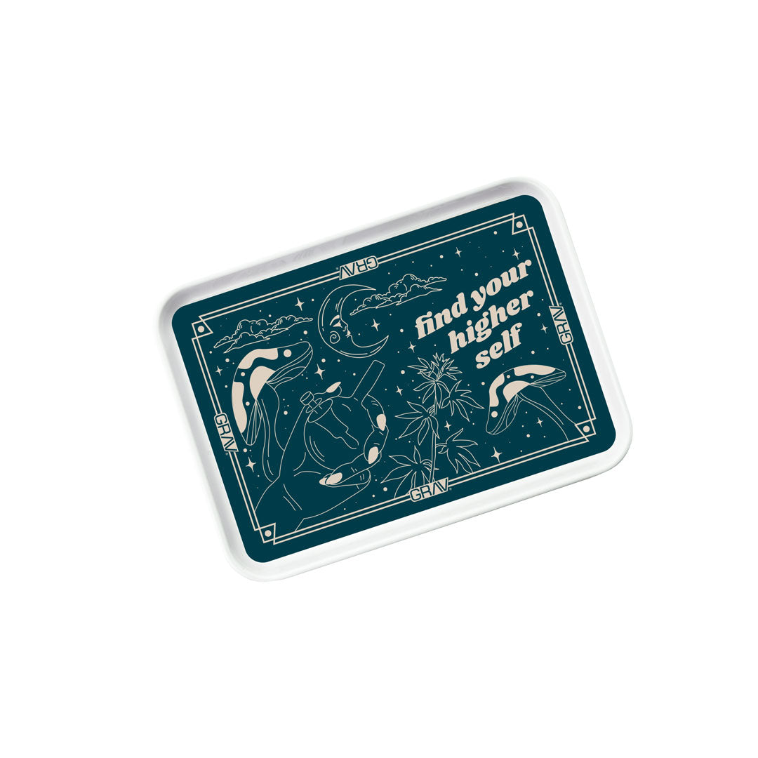 Made of thick, sturdy melamine, the small rolling tray features custom cosmic artwork and our “Find Your Higher Self” tagline.