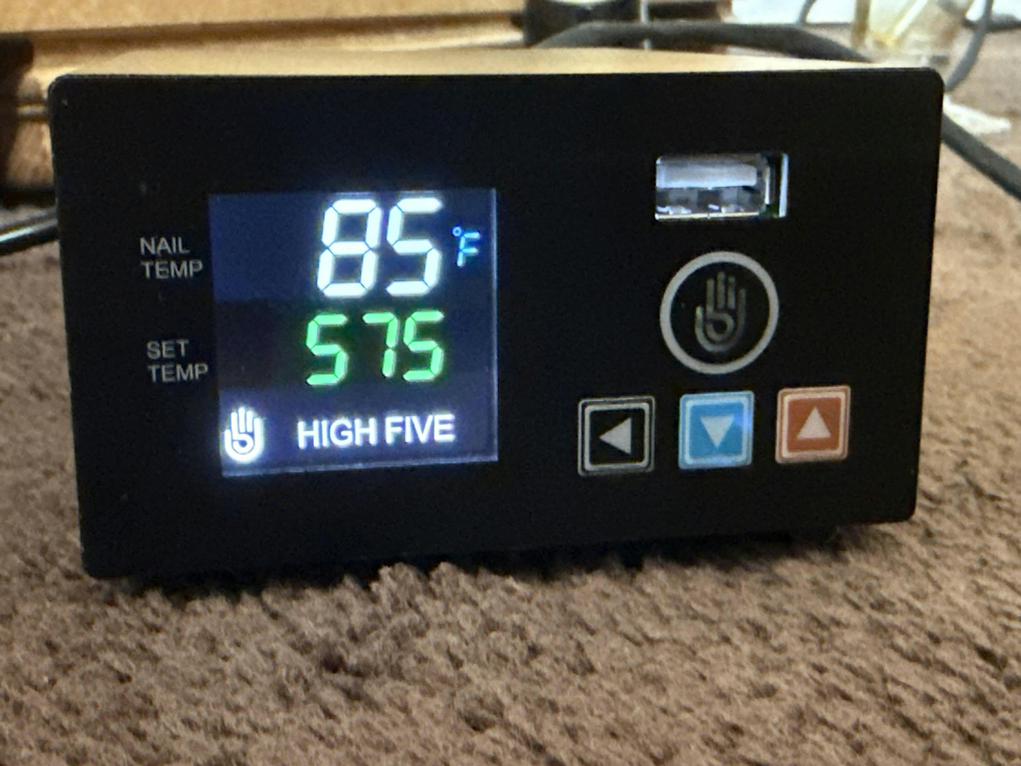 The LCD HIgh Five Enail is one of the best Enails on the market! The temperature displayed is the temperature of the vaporizing surface, NOT the coil temperature like other companies. Pre-calibrated to ensure the display temperature is precise and accurate. It is powered by a Microprocessor instead of a PID like other companies. Smarter "Brain" allows for more Features/Functions, Low Energy Usage, Steady Temperature (no more than 1-3°F fluctuation) and Longer Lifespan. The coil connection is a 5PIN Female XLR connector