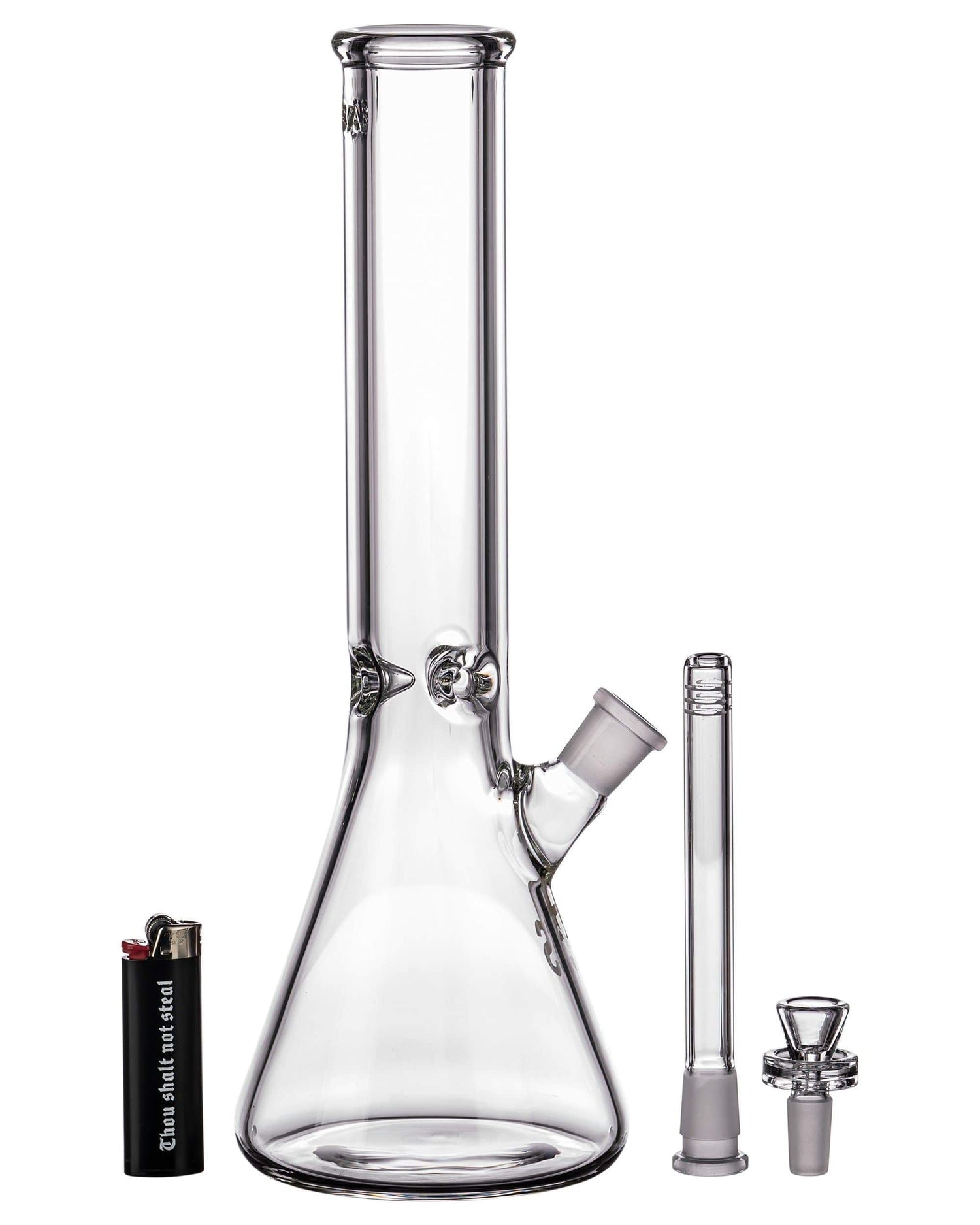 The Higher Standards Heavy Duty Beaker bong is made of medical grade 7mm thick borocilicate glass hand crafted in the USA. The long neck of this 14" beaker features a rounded mouthpiece and a three pinch ice catcher, providing a cooler smoother hit when desired. The main beaker base chamber is powered by a removable 5mm thick downstem perc and uses a 14mm male bowl to house your dry herbs. Included is a Higher Standards silicone ice mold designed to create an ice block that fits perfectly in the neck of the beaker. All of this comes in a reusable storage box with fitted foam compartments making this a great gift and the perfect pick for smokers old and new, recreational or medical. Higher Standards maintains exactly that with this beautiful classic Beaker bong.