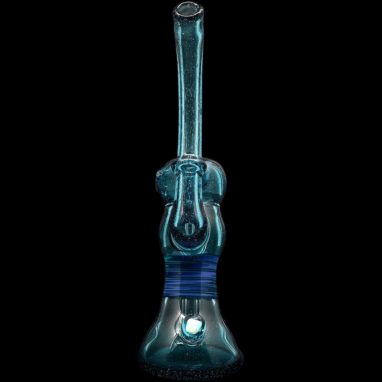 This is a one-of-a-kind handmade glass sherlock bubbler by Chris Lezak. The one-of-one glass pipe features a reversal disc, silver fuming, and an encased opal marble. This pipe is made of five separate sections that are welded together. This sherlock bubbler pipe has a perfect depth bowl and does not have any areas that restrict airflow.