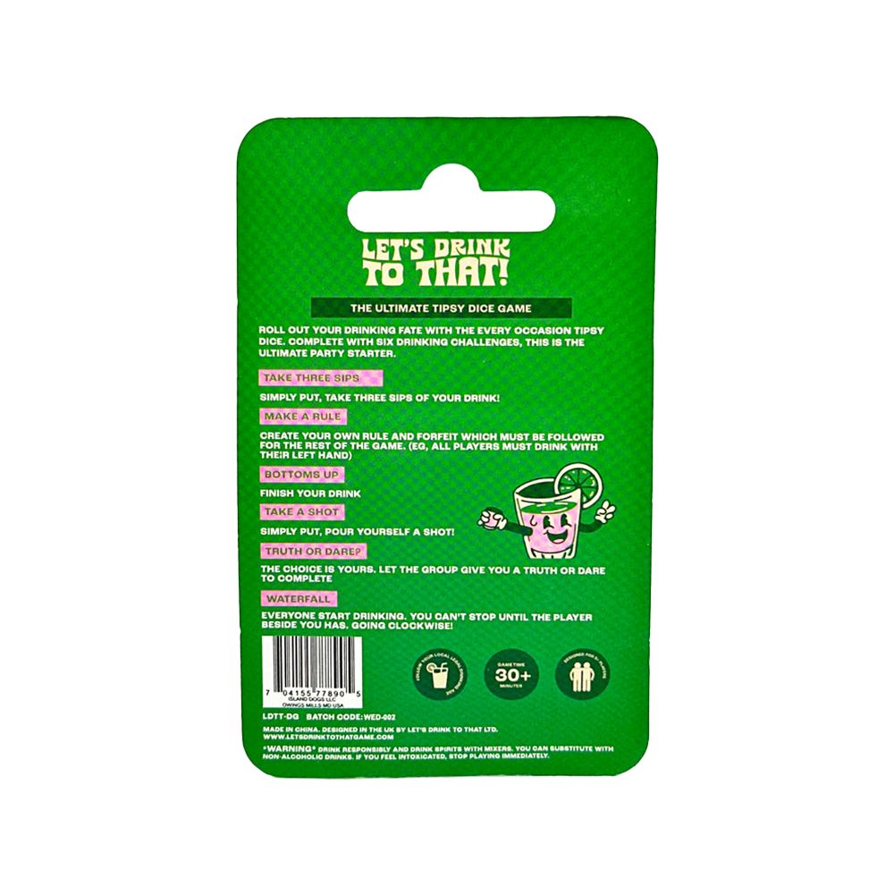 Get ready to roll the dice and let fate decide your next drink with Let's Drink To That: The Ultimate Tipsy Dice Game! This game is all about fun, laughter, and maybe a little bit of chaos as you and your friends roll your way to the next drink challenge. Whether you're at a party, pregame, or just hanging out, this game will get everyone in the mood for a good time.