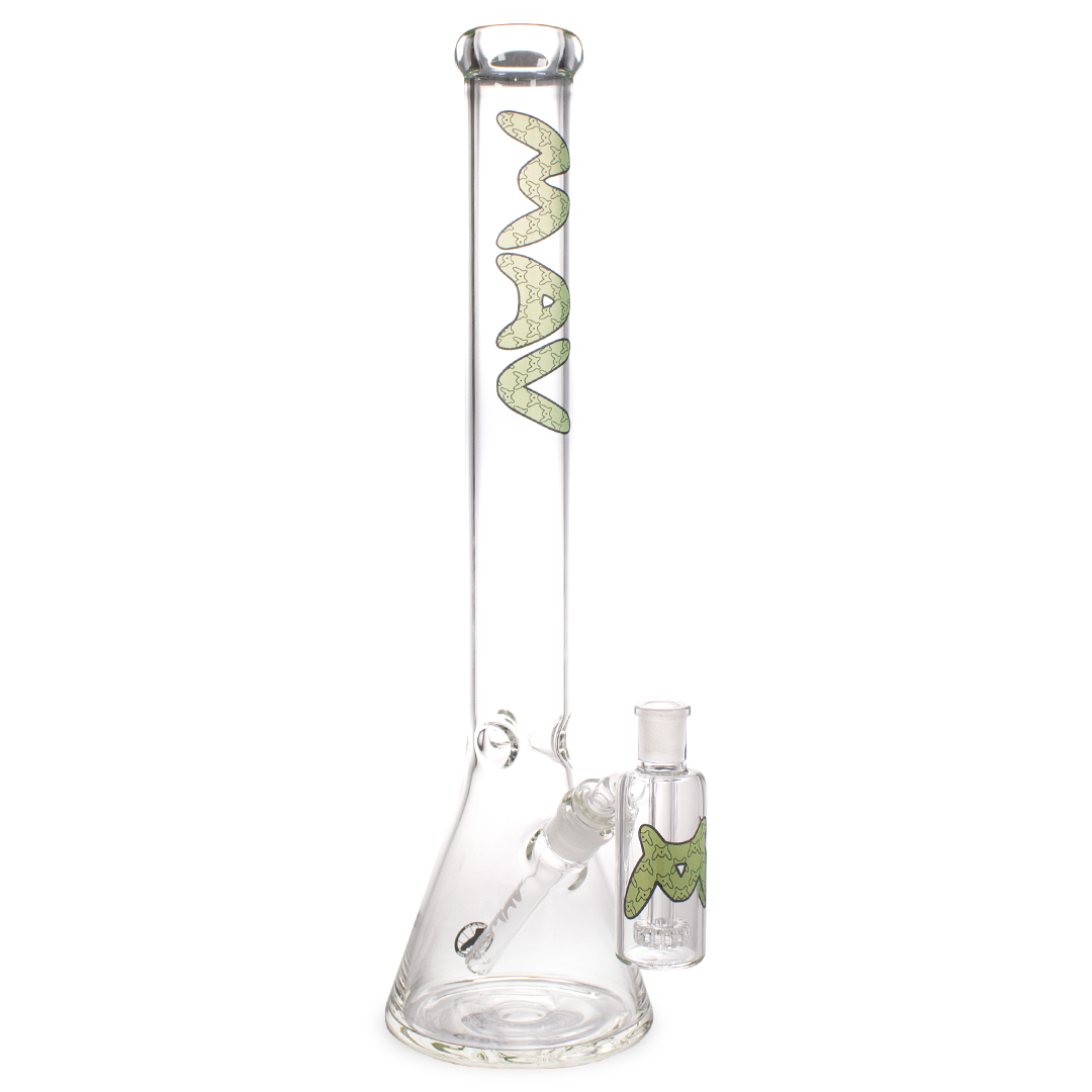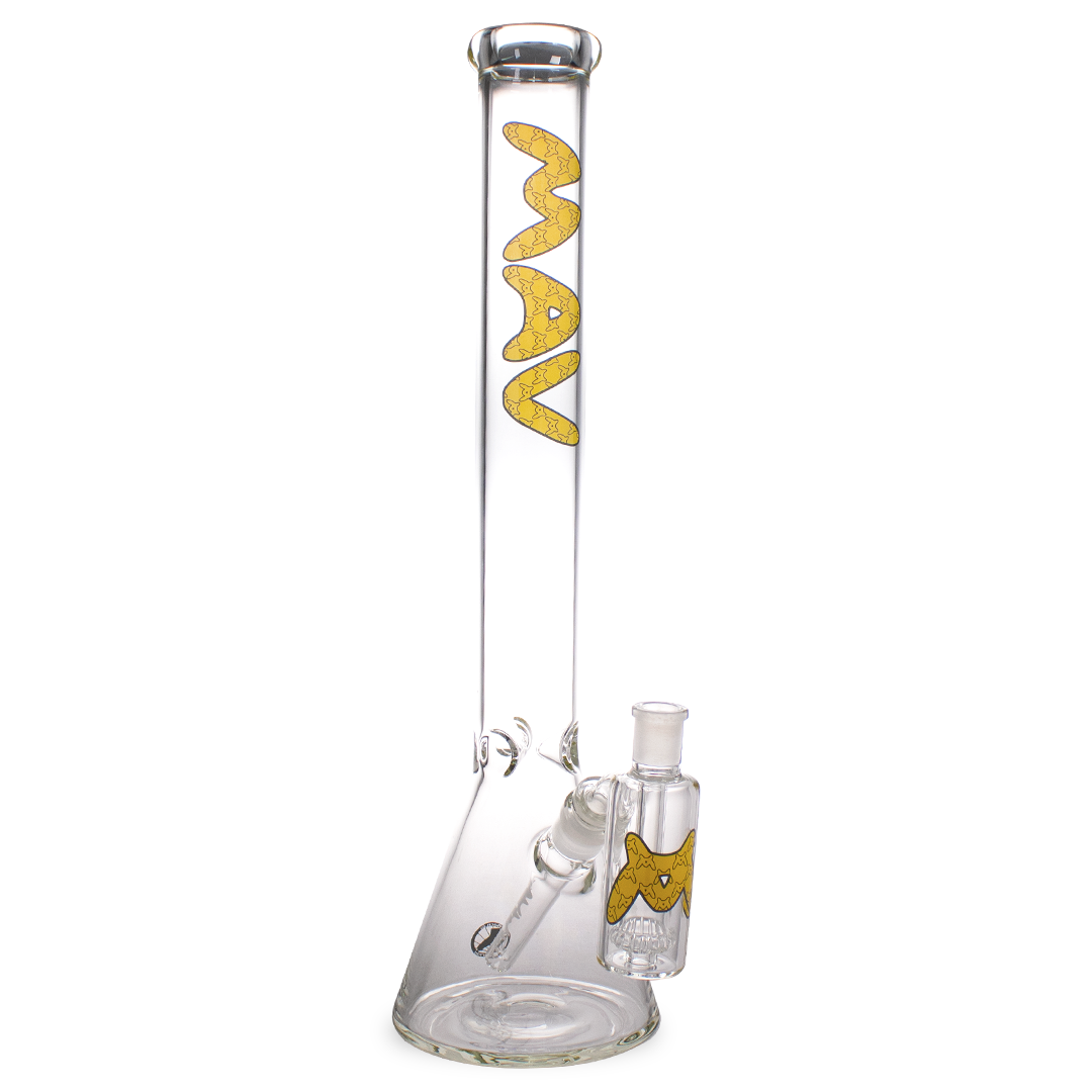 This Mucci MAV label beaker includes a matching ash catcher with a fixed percolator to help you keep your piece clean and your smoke filtered. Standing at 18'' tall, this bong features an ice pinch for extra cooling, an 18mm to 14mm removable diffused downstem and a 14mm male bowl.