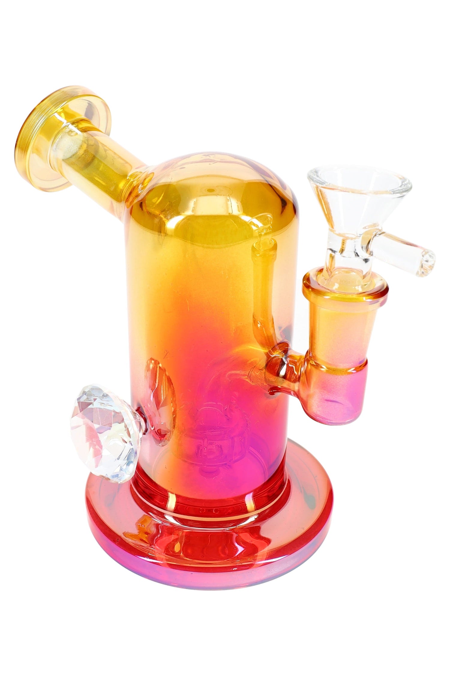 Shine bright on every session with this compact mini bong. The metallic, color-shift finish pops in any light, while a stemline showerhead percolator cools and smooths each pull without adding bulk. A faceted jewel grip doubles as a statement piece and a handy hold when you pass it around.