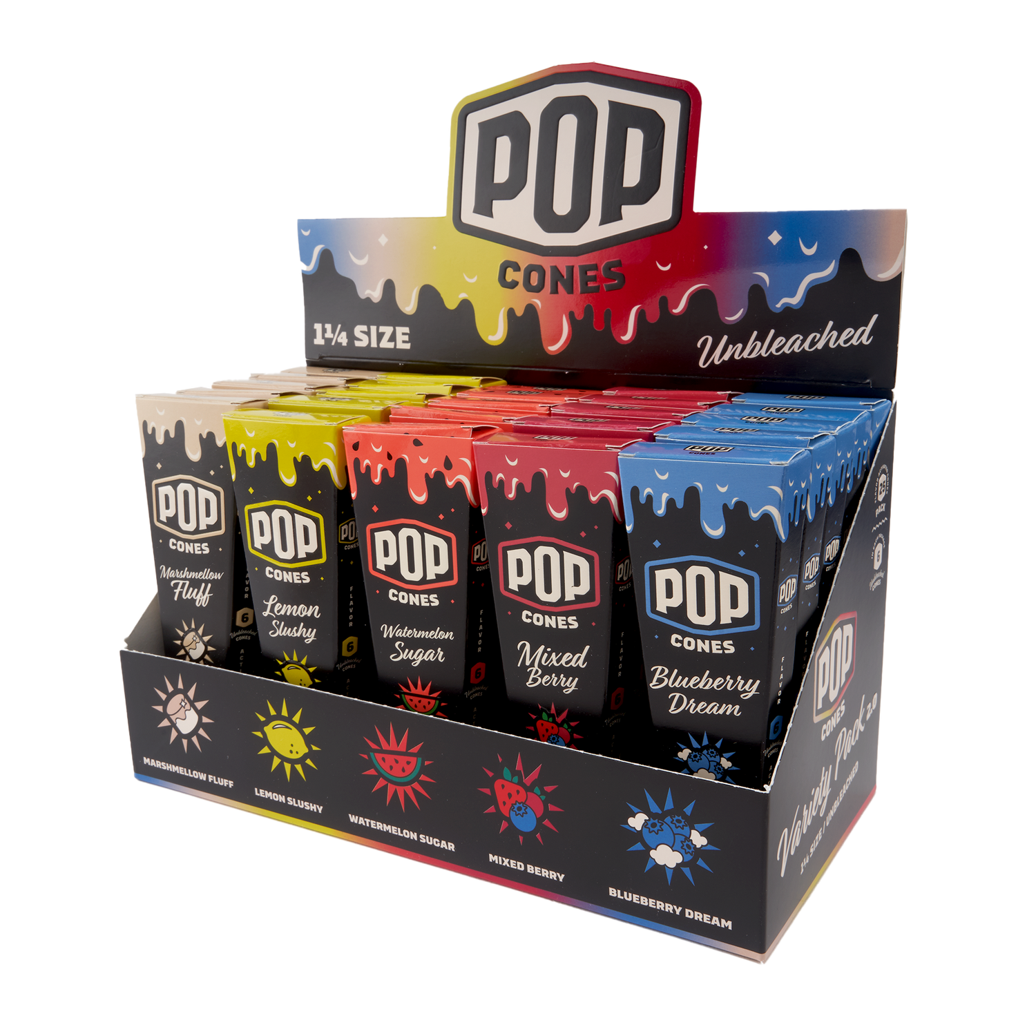 This assorted Pop Cones display is perfect for customers who want variety, clean-burning unbleached paper, and the flexibility to enjoy flavor only when the mood hits.