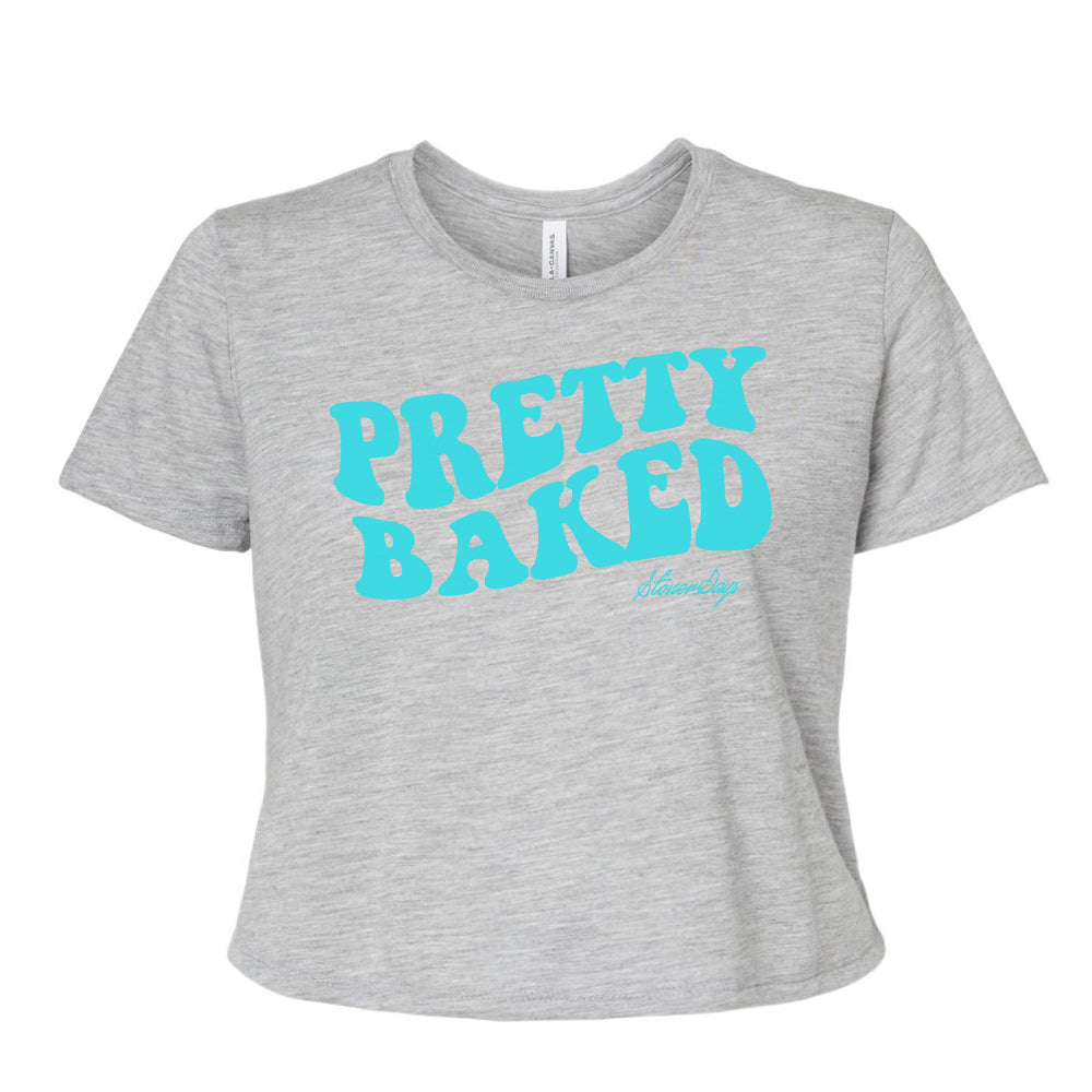 The teal color of this crop top is perfect for summer and will add a pop of color to any outfit. The Pretty Baked logo is a fun and playful way to show off your love for all things marijuana. Whether you're heading to a festival or just hanging out with friends, this crop top is the perfect addition to your stoner gear.