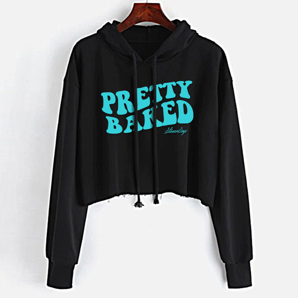 The Pretty Baked Logo on the front of the hoodie is a vintage-inspired design that features the StonerDays logo and the words "Pretty Baked" in a beautiful mauve color. The teal color of the crop top hoodie is eye-catching and perfect for those who love pretty vibes.