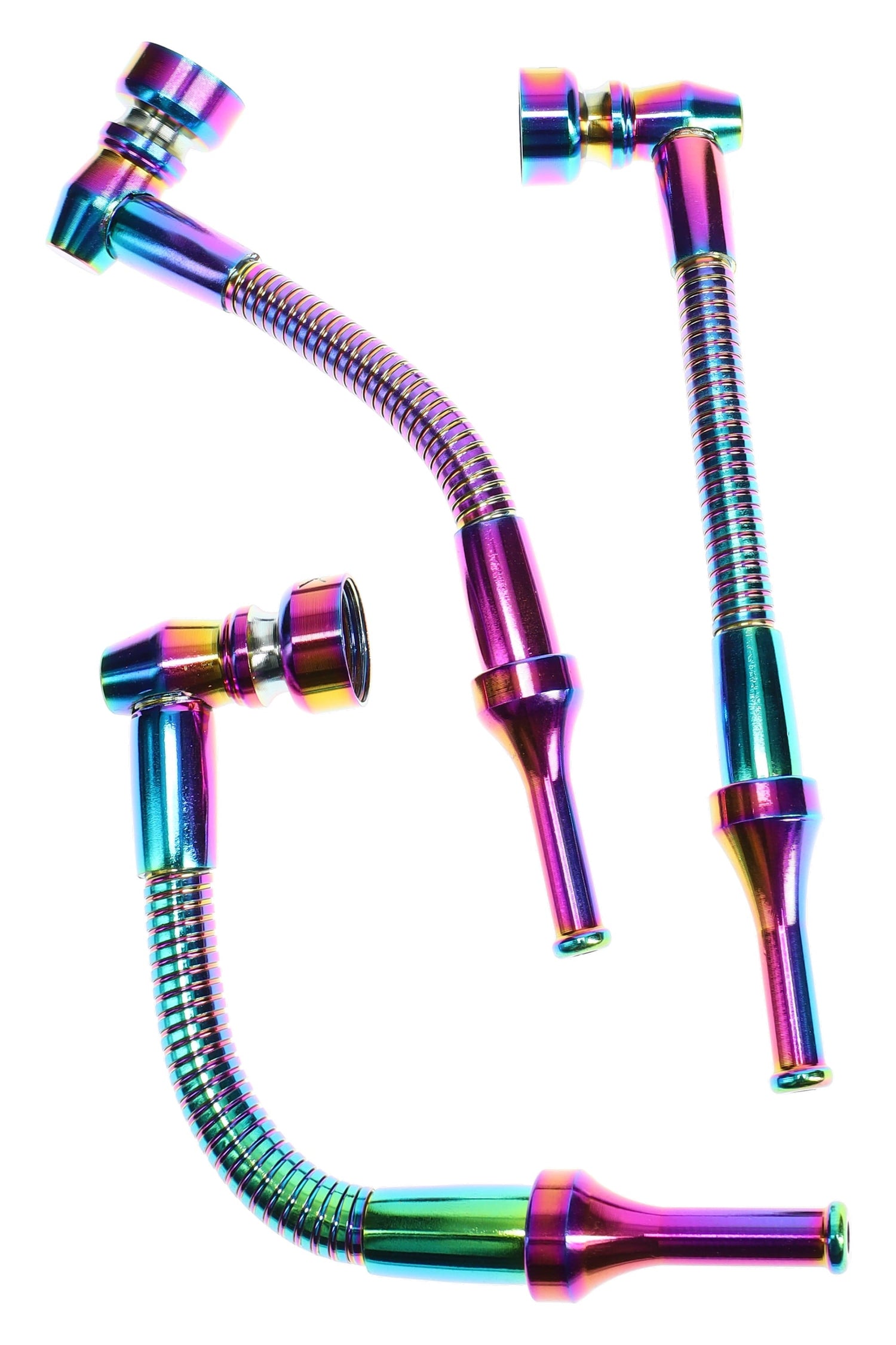Meet the pocket-friendly pipe that bends to your setup. This rainbow metallic hand pipe features a flexible spring neck so you can angle the bowl where it’s most comfortable, then stash it without fuss.