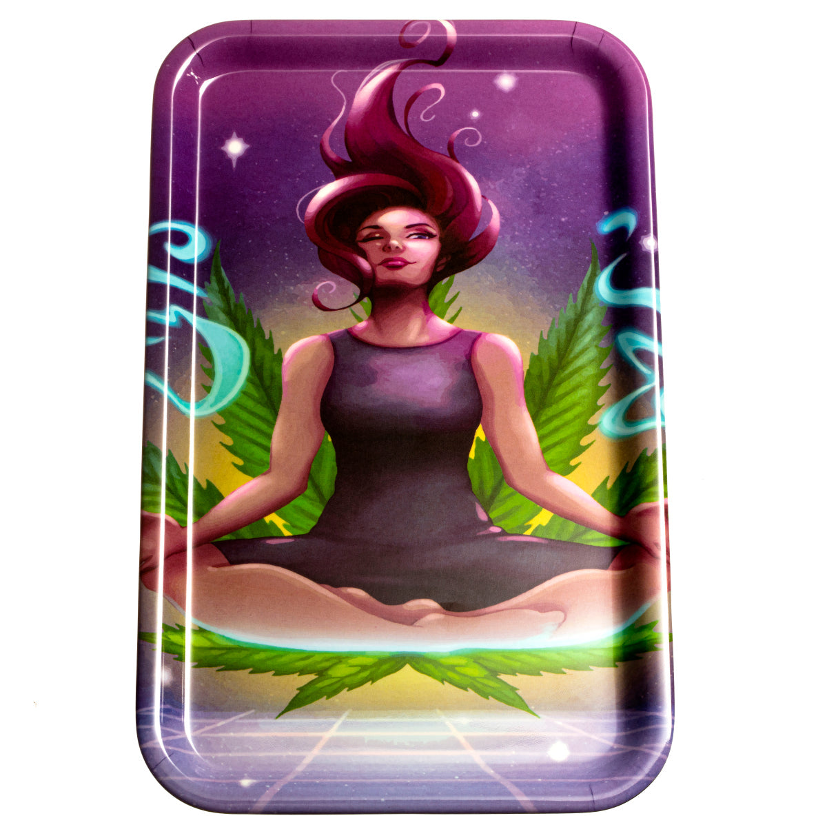 The Rollin Budz Calm And High rolling tray has a relaxed look that fits right into any setup. The artwork has a mellow vibe without being loud, and the size feels just right for daily use. It’s big enough to spread out but still easy to grab and take with you when you’re heading out.