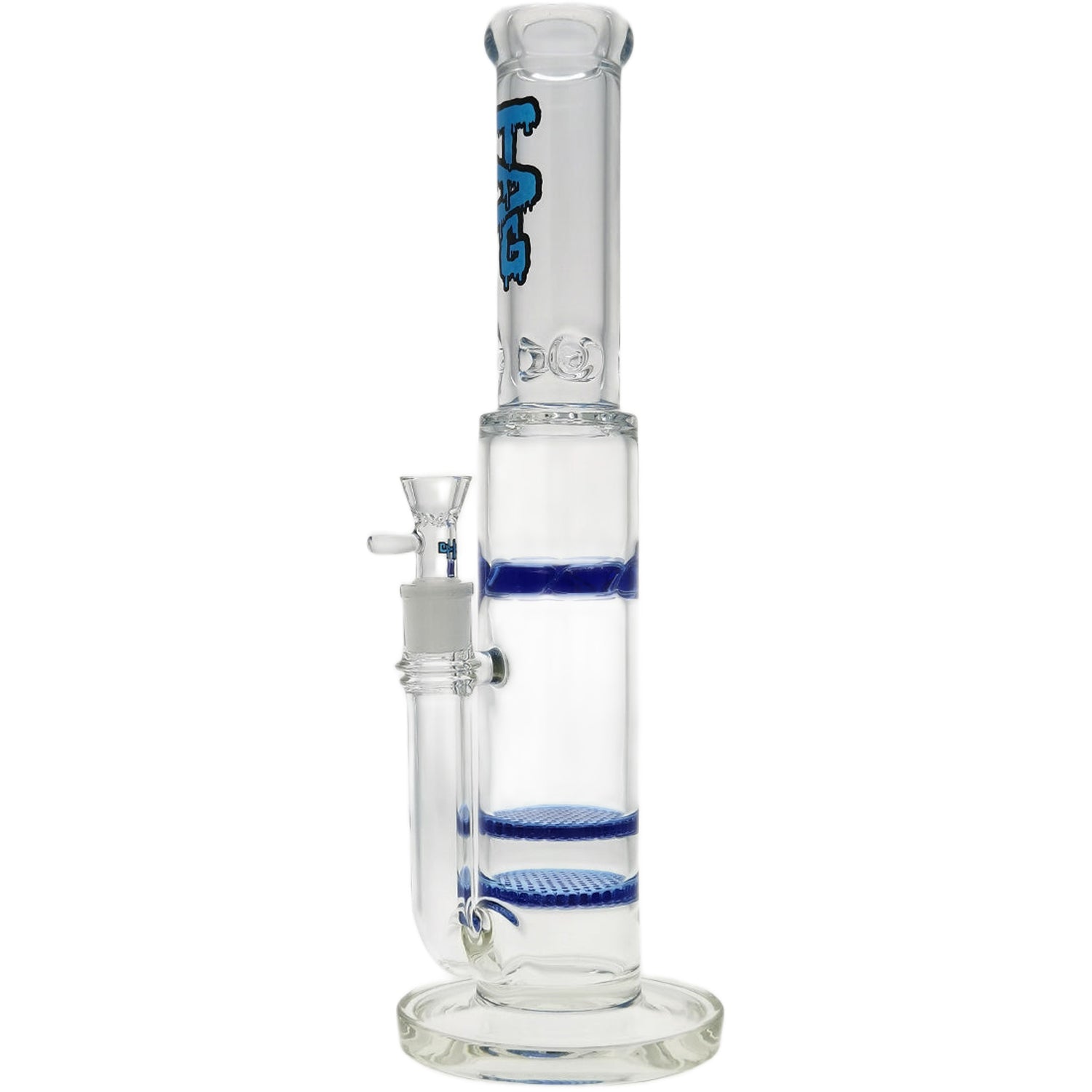 Thick Ass Glass 16" Glass Double Honeycomb Bong w/ Spinning Guard - Wavy Blue Label - Blue Accents (Discs) .04 is backordered and will ship as soon as it is back in stock.