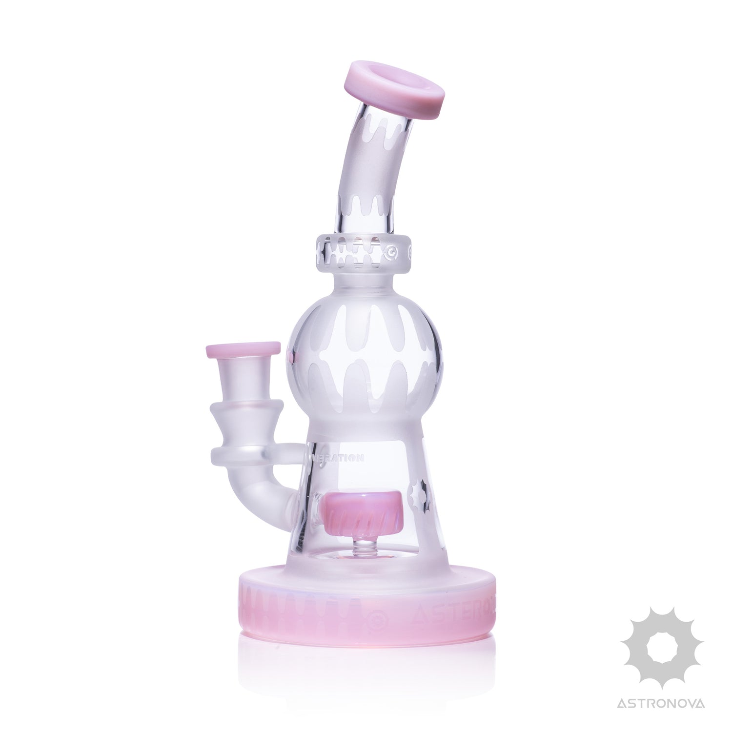 At the core is a built-in percolator paired with a recycler system that keeps vapor moving through continuous water circulation. This helps cool each pull while maintaining flavor, making it a solid daily driver for concentrate sessions. Pops of jade blue, jade purple, and jade pink on the base, joint, and mouthpiece add just the right amount of visual contrast without overpowering the design.